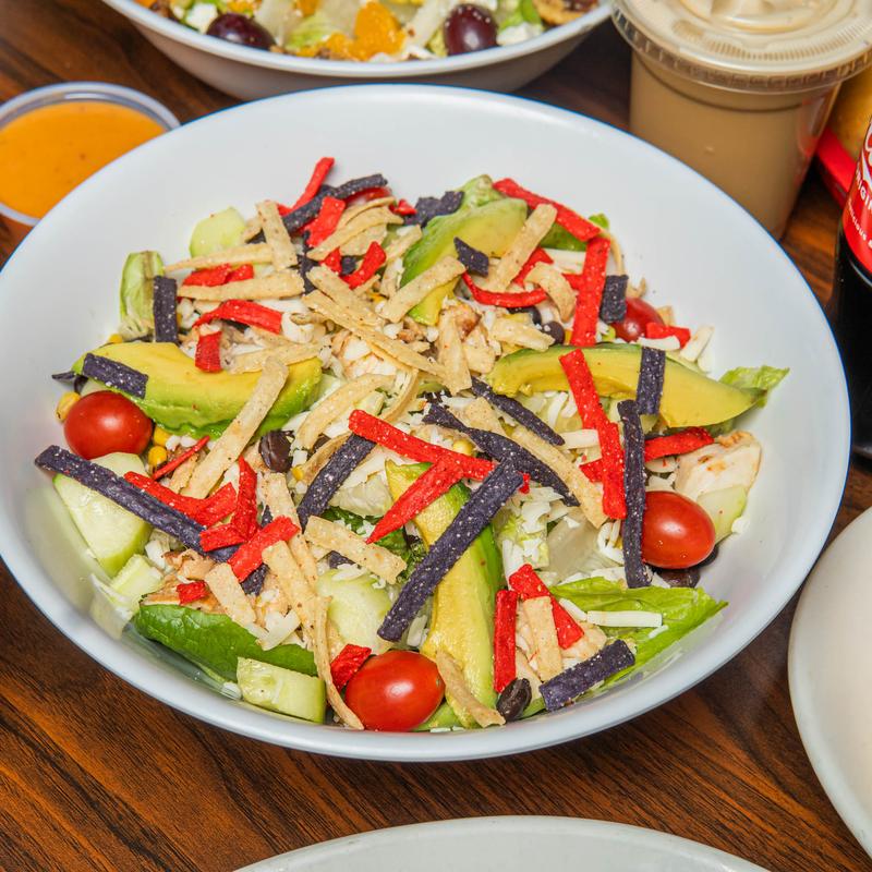 Romaine, spring mix, chicken, cucumbers, roasted corn, black beans, cherry tomatoes, pepper jack cheese, avocado, tortilla strips, and Southwestern dressing.
