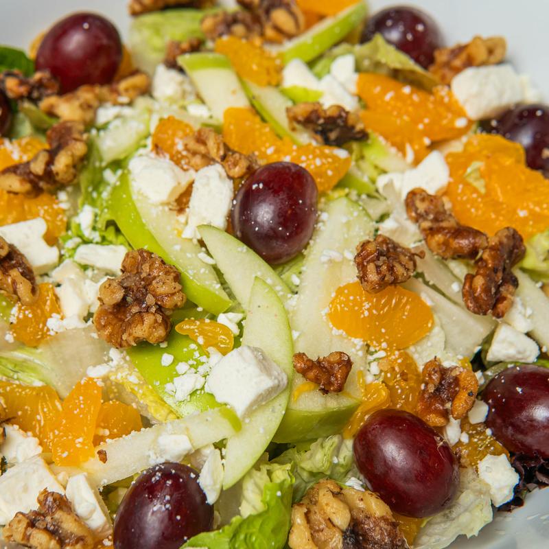 Romaine, spring mix, apples, oranges, grapes, walnuts, feta, and maple dressing.
