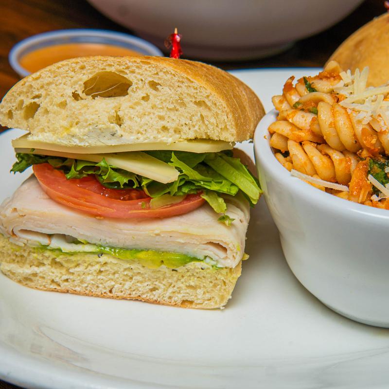 Turkey, Swiss cheese, avocado, tomatoes, spring mix, and pesto cream cheese on toasted ciabatta bread.